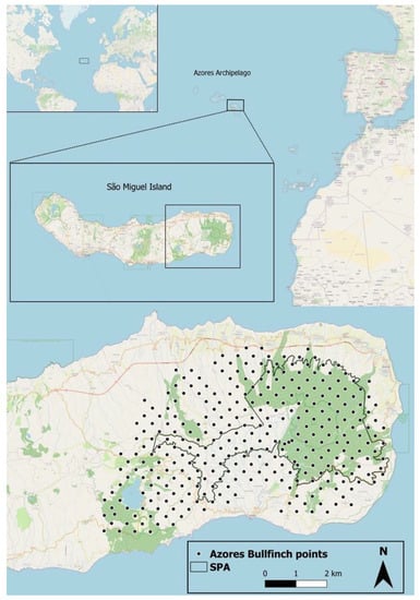 The Azores bullfinch distribution area (Figure 1) comprises the mountainous region in the eastern part of São Miguel Island (Archipelago of the Azores, Portugal), included in two Natura 2000 sites, namely the Special Protection Area (SPA) “Pico da Vara/Ribeira do Guilherme”, and the Site of Community Importance (SCI) “Serra da Tronqueira/Planalto dos Graminhais”. The habitat of the Azores bullfinch is the Azorean Laurel Forest; however, due to human intervention, it has been substantially altered. For this reason, the distribution area of the bird includes spots of Laurel Forest (with different degrees of degradation due to invasive alien plant species presence) and anthropogenic landscapes such as pastures, roads, and agriculture fields.