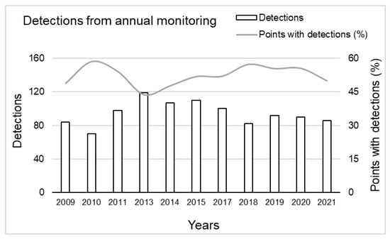 Summary of Azores bullfinch detections in the annual monitoring, from 2009 to 2021. The secondary axis shows points with detection percentages.
