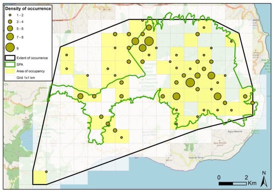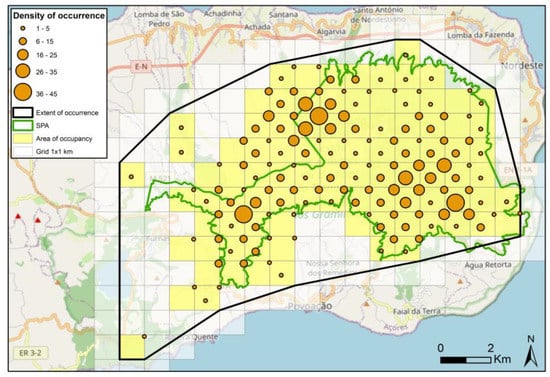 Using the data from the single morning survey, we estimated the range of the Azores bullfinch by using the occurrence and occupancy areas (IUCN, 2001). The occurrence area corresponds to the minimal polygon that includes the UTM 1 × 1 km units with bird detections. The occupancy area is the sum of the UTM 1 × 1 km units with bird detections.
