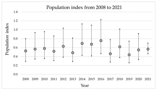 The population index was calculated from 2008 to 2021 (except in the years of the single-morning study, namely 2008, 2012, and 2016), providing a long-term trend.