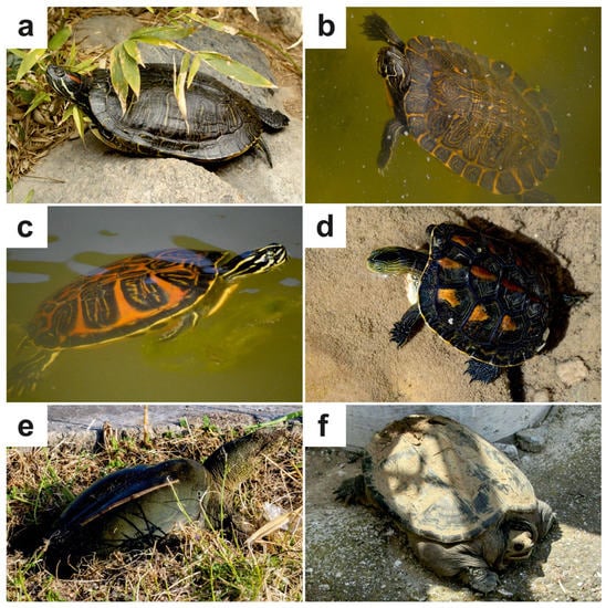 - Ferri, V.; Battisti, C.; Soccini, C.; Santoro, R. A hotspot of xenodiversity: First evidence of an assemblage of non-native freshwater turtles in a suburban wetland in Central Italy. Lakes Resrv. Res. Manag. 2020, 25, 250–257. [Google Scholar] [CrossRef]