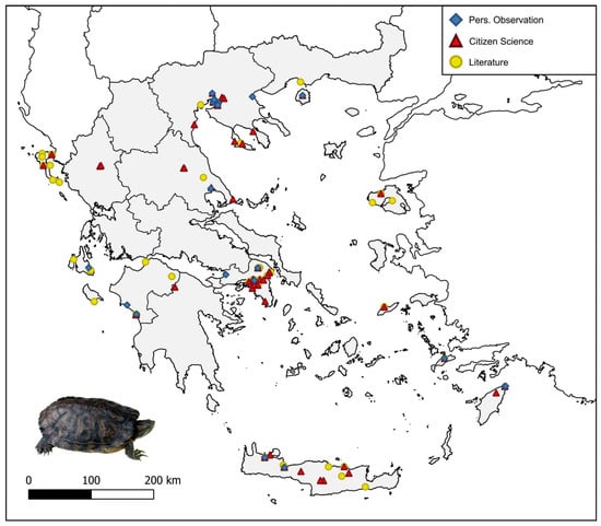 Citizen science, i.e., public participation in research, is emerging as a powerful tool for biological invasion surveillance, which might revolutionize our ability to handle IAS in the early stages of the invasion. In Greece, data provided by citizen scientists have aided research endeavors in intercepting alien species at the onset of their invasion or mapping their spread [,,]. Even though the validity and taxonomic accuracy of photographic data provided by citizen scientists can sometimes be of question [,,], the distinctive morphological features of alien species can be used to distinguish them from their native counterparts [,]. Citizen science has facilitated herpetological research on numerous occasions worldwide [,], although in Greece only a few recent studies have supplemented their dataset with citizen-science data [,,].