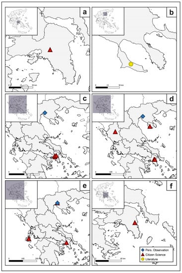 - Kalaentzis, K.; Kazilas, C.; Demetriou, J.; Koutsoukos, E.; Avtzis, D.N.; Georgiadis, C. Alientoma, a dynamic database for alien insects in Greece and its use by citizen scientists in mapping alien species. Insects 2021, 12, 1101. [Google Scholar] [CrossRef]