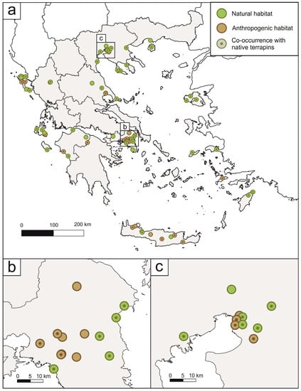 - Christopoulos, A.; Zevgolis, Y.G. A new invasion of the common slider on a Mediterranean island (Lesvos, Greece): A potential threat to native terrapin populations? Diversity 2022, 14, 1018. [Google Scholar] [CrossRef]