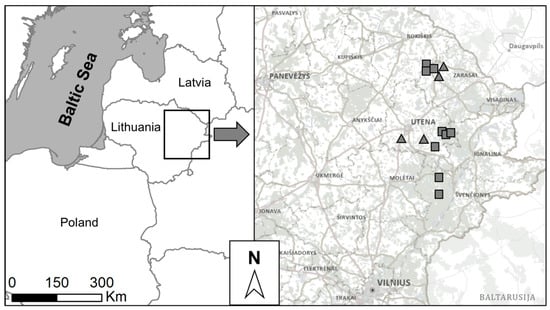 Map of the study area showing the raptor bird’s nests locations with UV light traps. Square figures designate Buteo buteo nests, and triangle figures Clanga pomarina nests.