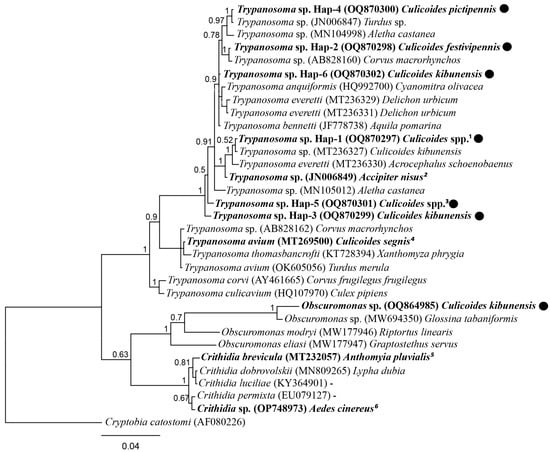 Bayesian phylogenetic tree of Trypanosoma sp., Obscuromonas sp. and Crithidia sp. using 18S rRNA. The tree was rooted using a Cryptobia catostomi. Names of parasites in bold font represent sequences detected in wild biting midges during this investigation, of which those marked with a dot represents new haplotypes. Hosts in which parasites have been detected are provided, and in case of multiple hosts detected during this investigation are marked as: 1—parasites have been also detected in Culicoides kibunensis, C. segnis, 2—in C. kibunensis, 3—C. festivipennis, C. kibunensis, C. pictipennis, C. segnis, 4—C. pictipennis, C. segnis, Simulium vernum, 5—C. festivipennis, C. kibunensis, C. pictipennis, 6—C. festivipennis.