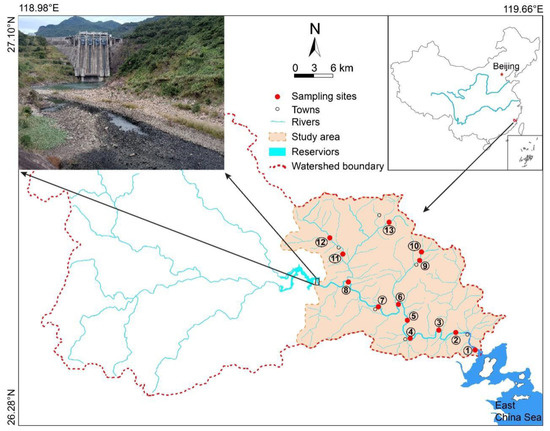 In Hongkou town, located along the upper reaches of the Huotong River, the river is cut off by the Hongkou reservoir (Figure 1). The samples were only collected from the lower reaches of the watershed in this study. Thirteen sampling points were set in the estuary, trunk, and tributary of Huotong River (Figure 1). According to the location of the sampling points and the difference in human activities, the thirteen sampling points were divided into six regions for analysis, namely, the estuary of the river (GLXS), downriver (GLXY) and upriver (GLSY) sections, one tributary flowing through a town (CZZL), one tributary with a barrage (LHBZL) and the source of one tributary (YSZL).