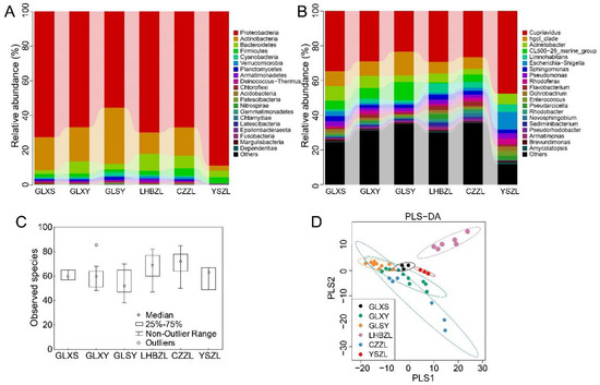 The diversity and richness of water bacteria among the GLXS, GLSY, CZZL, GLXY, LHBZL, and YSZL groups. The relative abundance of the bacteria among the GLXS, GLSY, CZZL, GLXY, LHBZL, and YSZL groups at the phylum level (A) and genus level (B). The x-axis represents groups and the y-axis represents relative abundance presented as a percentage. The amount of observed species in the GLXS, GLSY, CZZL, GLXY, LHBZL, and YSZL groups (C). The x-axis shows the different groups and the y-axis shows the observed species. Validation of PLS-DA for species similarity and distribution among the GLXS, GLSY, CZZL, GLXY, LHBZL, and YSZL groups (D).