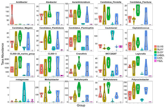 Special species in GLXS, GLXY, GLSY, LHBZL, CZZL, and YSZL water samples were studied further. The results showed that the genus Acidibacter had the highest abundance in GLXS (Figure 3). The abundance of the genera Caulobacter and Metagenome was highest at LHBZL. However, the abundance of all genera except the three genera mentioned above was highest at GLSY. Meanwhile, at YSZL there were almost no other bacteria except Caulobacter. The abundance of the genera Candidatus-Flaviluna, Candidatus-Megaira, Aurantimicrobium, Cephaloticoccus, and Polynucleobacter at GLXY was similar to that at CZZL.