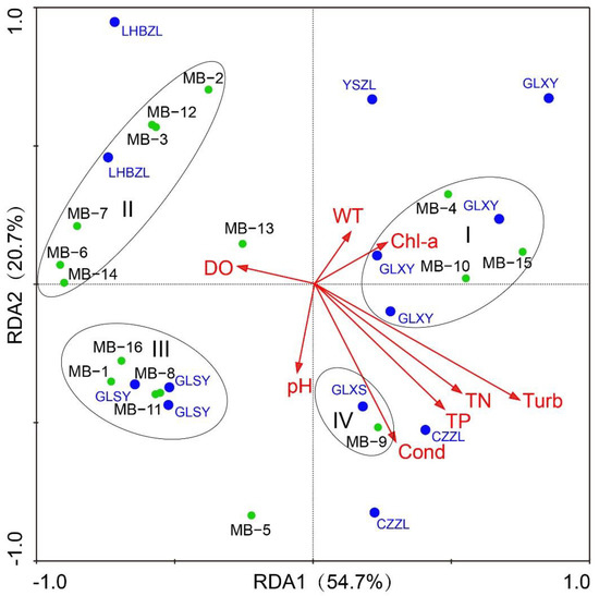 The results of RDA showed that the first principal axis and the second principal axis explained the variance in the relative abundance of the microbial community by 54.7% and 20.7%, respectively, and the total explaining rate was 75.4% (Figure 4). The first principal axis had the greatest positive correlation with turbidity, while the second principal axis had the greatest negative correlation with conductivity. From the angle between conductivity and turbidity, we found an obvious positive correlation. Different environmental factors had different effects on the microbial community, and the effect was shown as obvious clustering. The four clusters I, II, III, and IV corresponded to the microbial community characteristics of GLXY, LHBZL, GLSY, and GLXS, respectively (Figure 4). Most of the microorganisms in cluster I had the function of degrading nitrogen and phosphorus organic matter [28]. Additionally, the positions of Armatimonadetes (MB3) and Gemmatimonadetes (MB12) in the diagram were similar, indicating that the phylum in the same cluster had a certain similarity in terms of ecological function. The effect of turbidity on the microorganisms was positive for GLXY and CZZL, while it was negative for GLSY and LHBZL. The effect of conductivity on the microorganisms was positive for GLSY and GLXS, while it was negative for GLXY and LHBZL.