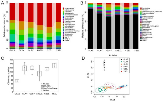 In addition, the results showed that the number of species observed was similar at GLXY and GLXS. The highest and lowest number of species were observed at CZZL and GLSY, respectively (Figure 2C). The PLS-DA results indicated significant differences in bacterial diversity at LHBZL and relatively uniform bacterial diversity in other groups (Figure 2D).