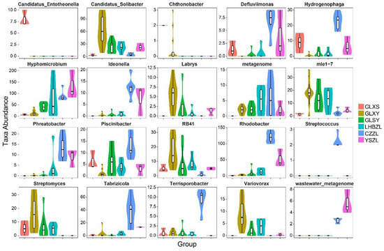 The results for taxa abundance analysis showed that Candidatus-Entotheonella only existed at GLXS and that the abundance of Chthonobacter at GLXS was higher than that in other sampling groups (Figure 6). The genera Candidatus-Sollbacter, Labrys, mle1-7, RB41, Streptomyces, and Variovorax had the highest abundance at GLXY. Additionally, the genera Defluvllmonas, Hydrogenophaga, Phreatobacter, Piscinibacte, Tabrizicola, Rhodobacter, and Terrisporobacter existed in the highest abundance at CZZL. The genera Hyphomicrobium and Wastewater-metagenome had the highest abundance at YSZL. The abundance of the genus metagenome appeared at GLXS, YSZL, GLXY, GLSY, CZZL, and LHBZL from low to high. The genus Streptococcus only appeared at CZZL.
