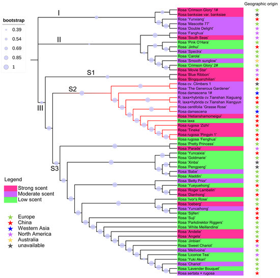 The phylogenetic relationship of rose cultivars using SNP markers. The bootstrap values are indicated with bubbles. The classification of floral scent is highlighted with a background color, where pink, purple, and green represent a strong-scent rose, a moderate-scent rose, and a low-scent rose, respectively. The geographic origin of each rose is indicated with a colored star, with a green star for Europe, a red star for China, a blue star for western Asia, a purple star for North America, a yellow star for Australia, and a grey star for cultivars of unknown origin.