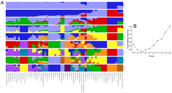 Genetic clustering and differentiation of rose cultivars using SNPs. (A) Cluster assignments for K = 2–9 estimated in the admixture. Each bar represents one rose accession, and the colors represent the partitioning of the sample in each group. (B) Cross-validation test values for a different number of clusters (K).