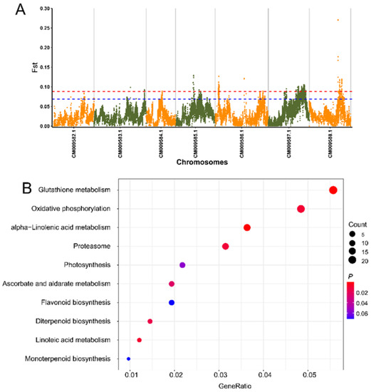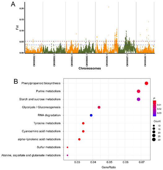 A total of 794 candidate genes in 47 windows were identified as being in the top 1% of maximum FST values (Table S14). The alpha-linolenic acid metabolism pathway were significantly enriched in genes (seven genes) identified in the top 1% of Fst sliding windows (Figure S4, Table S15).