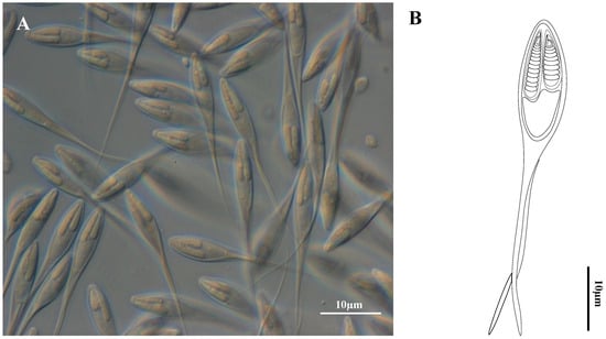 Formalin-fixed, mature myxospores (n = 30) in frontal view measured 47.9 ± 4.9 (39.5–60.8) µm total length, 14.4 ± 1.6 (12.4–20.5) µm spore body length, 4.0 ± 0.6 (2.7–5.3) µm wide and 33.7 ± 4.5 (26.4–45.2) caudal appendages length. In lateral view, the valves were asymmetrical and myxospores were 3.1 ± 0.4 (2.7–3.6) (n = 4) µm thick. Polar capsules (nematocysts) were unequal: the larger was 7.2 ± 0.8 (5.2–8.3) µm long and 1.5 ± 0.3 (1.0–2.2) µm wide and contained a polar tubule with 11–13 turns; the smaller capsule was 5.6 ± 0.7 (4.0–6.3) µm long, 1.4 ± 0.2 (1.0–1.8) µm wide and contained a tubule with 8–9 turns. (Table 1, Figure 1A,B).