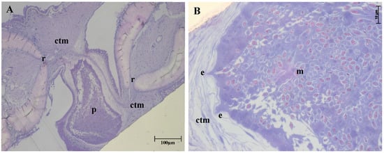 Histological thin section of fin of Semaprochilodus insignis with plasmodium of Henneguya correai n. sp. (A): Parasite plasmodium (p) in host connective tissue (ctm) between the rays (r). (B): Enlarged portion of A showing host–parasite boundary plasmodial expansions (e) toward the layered host connective tissue (ctm) and maturing myxospores within (m). Toluidine blue stain.