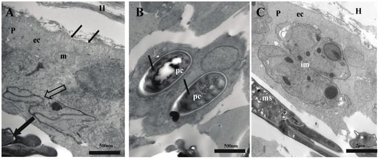 Electron micrographs of sections of Henneguya correai n. sp. in fins of Semaprochilodus insignis. (A) Host–parasite interface showing the plasmodium (p) developing in host (H) connective tissue; large empty arrow indicates immature myxospores, and large black arrow shows mature myxospore. The parasite ectoplasm (ec) has pinocytic channels, thin black arrows, with a mitochondrion (m); (B) mature myxospore with polar capsules (pc) and its coiled polar tubule (thin black arrows); (C) plasmodium showing longitudinal sections of immature myxospores (im) in the periphery and mature myxospores (ms) within.