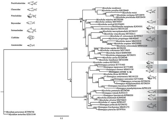 Maximum Likelihood tree based on ssrDNA sequences of myxobolids most closely related to Henneguya correai n. sp. and selected myxobolids from South America. GenBank accession numbers are given after species names. Nodal support values are shown for posterior probability (PP) and bootstrap (B). Values for weakly supported nodes (<0.9 PP and <70 B) are not shown. Gray scale rectangles differentiate fish families and their schematic fish figures.