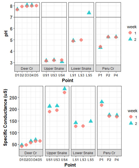 pH values and specific conductance in the Snake River watershed.