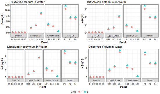 The CCU values based on the trace-metal concentrations are shown in Figure 3. Dissolved trace-metal and REE concentrations followed a similar pattern throughout the watershed. Figure 4 and Figure 5 present the dissolved concentrations of REEs with high and medium maximum concentrations, respectively. All the REEs in the high category were “light-group” REEs, defined as having an atomic number between 57 and 64.