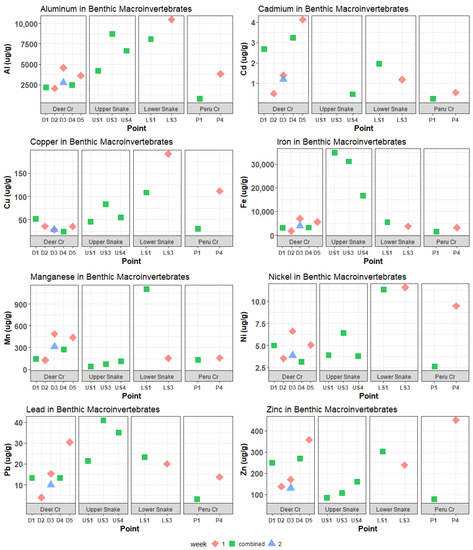- Farag, A.M.; Woodward, D.F.; Goldstein, J.N.; Brumbaugh, W.; Meyer, J.S. Concentrations of metals associated with mining waste in sediments, biofilm, benthic macroinvertebrates, and fish from the Coeur d’Alene Basin, Idaho. Arch. Environ. Contam. Toxicol. 1998, 34, 119–127. [Google Scholar] [CrossRef]