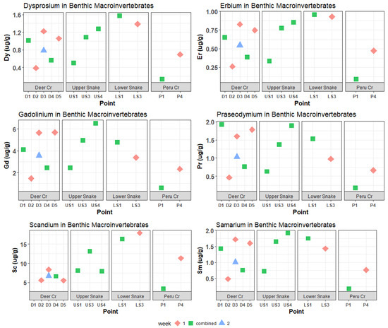 Dy, Er, Gd, Pr, Sc, and Sm concentrations in benthic macroinvertebrates. These REEs had medium maximum concentrations in water samples. Most of these elements also had medium maximum (between 1 and 2 µg/g) concentrations in invertebrates, but Gd and Sc were high (>6 µg/g) relative to other REEs. Concentrations of scandium at D1 were below the ICP-MS detection limits.