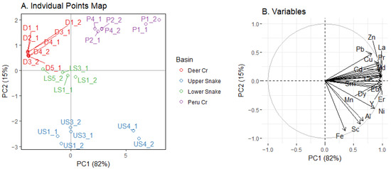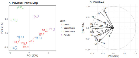 The PCA of trace-metal and REE concentrations in benthic macroinvertebrates did not show a distinct clustering by basin (Figure 10A). The first PC explained 60% of the variation. The loadings on PC1 were all negative, indicating that the overall magnitude of the concentrations drove the variation along PC1. Thus, because the concentrations in Deer Creek and the Upper Snake were similar, the PCA did not separate these two streams. The second PC explained 21% of the variation. The arrows for Fe, Zn, and Mn were the shortest, indicating that they had less of an influence than other elements (Figure 10B). Pb was the trace metal most strongly aligned with the REEs. Metal and REE loadings in invertebrates are presented in Table S7.