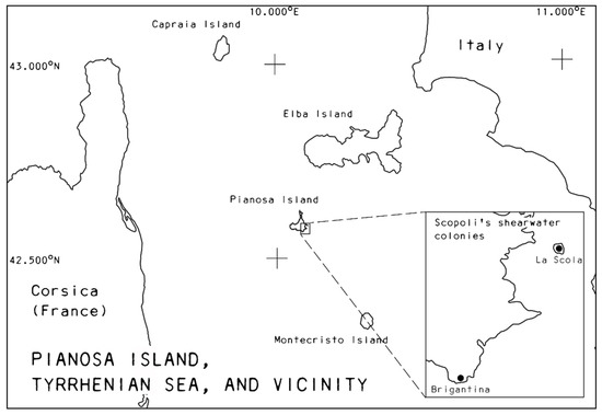 The study area was located on Pianosa Island (Italy, Lon. 10.078889 E; Lat. 42.585278 N, Figure 2), which is part of the Tuscan Archipelago National Park. It is a flat island, 10 square kilometers in size, rising from the sea to 30 m above sea level. Vertical cliffs, rockslide fields, and small bays are the most common coastal environments. Due to marine and karst processes, this coastal landscape provides suitable conditions for Scopoli’s shearwaters to nest. The main colony is located on an islet 242 m east of Pianosa Island (La Scola islet). Other sub-colonies are on the main island (the largest is on the cliffs of Punta Brigantina in the south).