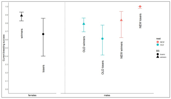 Females and males’ current breeding success depends on the state of departure. For females, current breeding success is explained by the outcome of the previous reproduction; for males, it is explained by the combination of previous BS and nest type. Notation: nest, nest type (light blue = first nest ever, OLD; red = changed nest, NEW); BS, previous breeding success (circles = losers, breeding failure; triangles = winners, breeding success).