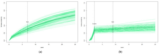 Reproductive life expectancy for females has been estimated as 7.01 years (95% CI 5.01–9.91) and for males as 9.01 (95% CI 6.2–13.2). We found that the probability of changing nests in the average reproductive life is equal among females and males (Pfemales 0.311, 95% CI 0.202–0.421; Pmales 0.308, 95% CI 0.217–0.399), but males’ changes are all concentrated in the first two years of reproduction (see Figure 4). In fact, males had a 6.4% chance after their first reproduction (see Supplementary Materials, Table S2.3) and a 21.7% increase the season after. After that, the likelihood of changing nests increased by only an average of 0.4% each year. Females had a chance of 9.4% to change nests after their first reproduction and an almost constant increase of 3.6% per year for their average reproductive life.