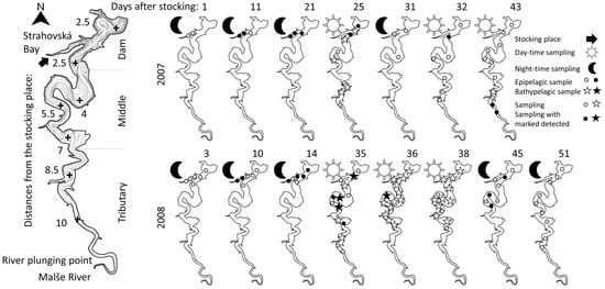 In Římov Reservoir, moreover, the original river valley created meanders in which the water currents caused by wind change rapidly. The variation in the water current direction could prevent pelagic larvae from moving from offshore areas to near-shore habitats with high densities, as in large circular and more wind-exposed lakes []. In the epipelagic layer of Římov Reservoir, there is no significant surface flow from the Malše River toward the dam that would have to be overcome during upstream migration (due to a lower temperature, the river plunged into the intermediate layer of the water column 0.5–1.5 km from the tributary), and the stocked larvae, with a standard length of about 7 mm, are probably too small to overcome distances in the order of several kilometers. After five weeks, when the marked pikeperch were first captured at considerable distance from the bay, they had a standard length of about 13–15 mm, twice the size at release. Because larger fish have greater swimming ability [], the fish larvae must remain at the stocking site to grow and transform into juveniles with fully developed fins, so they can overcome larger distances and migrate to more appropriate foraging habitats. After five weeks, marked pikeperch were rarely, but almost exclusively, caught outside the bay in which they were released. One theoretical explanation is the high mortality of early pikeperch stages in the reservoir, and that some stocked fish left their stocking location between the surveys. An unknown part of the 0+ pikeperch can migrate downstream of the reservoir []. In 2007 and 2008, nearly half a million pikeperch larvae were stocked into the reservoir. Only 10 days after stocking, during trawling in the bay where the marked pikeperch were stocked, and where therefore the highest density of marked pikeperch should be present, the proportion of marked pikeperch to the total 0+ pikeperch cohort was mostly less than 10% (Table 1). Although this was not the main objective of this study, this fact indicates that the natural reproduction of pikeperch in the reservoir is not negligible. The fact that 0+ fish abundance in late summer in the reservoir is usually very low [] indicates that larval and early juvenile mortality is high, or that 0+ pikeperch move to areas not sampled (e.g., steep shores with boulders and stumps) or out of the reservoir system.
