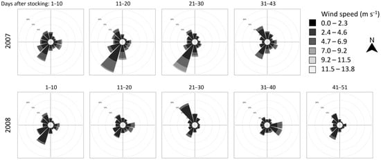 Wind velocity and direction data were recorded from a flouting meteorological tower (FIEDLER AMS s.r.o., České Budějovice, Czech Republic) installed 100 m from the nearest bank and 600 m from the mouth of the stocking bay in the dam section of the reservoir (48.849 N, 14.487 E). Wind data, for the period when the marked pikeperch were stocked and samples taken, were measured in 10 min intervals and graphically summarized using the windRose package [] in R software [].