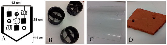 Illustration of the different substrates used for the settlement trials, including (A) Design and dimensions of the rearing tanks and the substrate structures within (B) PVC roll; (C) Wavy PVC plaque and (D) Tile fragment.