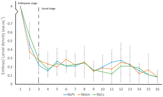 Mean Embryo and Larval density ± (SD), as ind·mL−1 registered over the first 16 days of development, according to their respective diets (Diet RbPt = Rhodomonas baltica + Phaeodactylum tricornutum; Diet RbSm = Rhodomonas baltica + Skeletonema marinoi and Diet RbCc = Rhodomonas baltica + Chaetoceros calcitrans, n = 3 tanks per treatment).