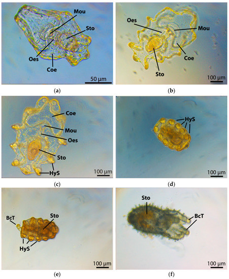 Different stages across Larval development of Holothuria arguinensis, including (a) early auricularia; (b) mid auricularia; (c) late auricularia; (d) doliolaria; (e) pentactula and (f) juvenile and their structures, namely (Mou) mouth; (Oes) oesophagus; (Sto) stomach; (Coe) coelom; (HyS) hyaline spheres and (BcT) buccal tentacle.