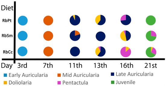 On the 3rd day after fertilization, there were no significant differences in terms of embryo survival percentages between the three treatments (RbPt = 5.60 ± 1.26%; RbSm = 6.92 ± 2.02% and RbCc = 7.08 ± 3.32%), according to a Kruskal–Wallis [H(2) = 1.633; p = 0.652]. As such, the larval development and growth trial began on this day when the first individuals at the early auricularia stage were first observed (Figure 3a). This stage is characterized by the appearance of a functional digestive tract, including the oral cavity, oesophagus, and stomach, enabling feeding on suspended microalgae [11]. On the 7th day after fertilization, all sampled individuals, regardless of diet, were in the mid auricularia stage, characterized by the cilia and functional structures becoming clearly distinguished from the coelom (Figure 3b). On the 11th day, the first sighting of individuals in the late auricularia stage took place. This stage is characterized by its larger size and the first appearance of hyaline spheres, where reserves begin to accumulate (Figure 3c). At this time, while larvae fed with diets RbPt and RbCc already presented most individuals at this stage (with some sampled individuals from diet RbPt already in the subsequent stage), the larvae fed with diet RbSm still had some individuals in the mid auricularia stage (Figure 4). On the 13th day, tanks supplied with diets RbPt and RbCc already showed individuals in the doliolaria stage, characterized by its more compact size and larger hyaline spheres relative to body size (Figure 3d), while larvae fed with diet RbSm still only presented individuals in the late auricularia stage. Despite a single pentactula individual being detected among those fed with diet RbCc on the 13th day, it was only on the 16th day that this stage was observed in the other diets. This stage, while similar in shape to the doliolaria stage, possesses a protruding oral tentacle with which the holothuroid feeds, the first major step in resembling a fully formed sea cucumber (Figure 3e). Lastly, on the 21st day, juvenile individuals (Figure 3f) were observed in the settling structures for the first time, regardless of diet.
