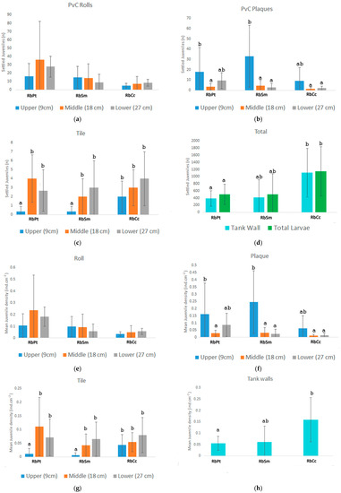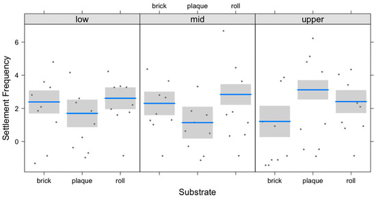 The GLM used to explain the settlement distribution of H. arguinensis exclusively within provided substrata (Table 3) indicates a lower density of settled individuals from Diet RbCc when compared to Diet RbPt (reference level), as seen in Figure 6a. The model also depicts a decreasing trend in density with increasing depth (Figure 6b). Using the low depth (27 cm) as the reference level, the upper depth (9 cm) presents a significant negative effect (Table 3). Additionally, while there were no significant preferences for any particular substrate in terms of the settlement, the upper depth shows a different settlement pattern. The plaques depict the highest average settlement preference, unlike the other depths in which the plaques have the lowest density (Figure 7).