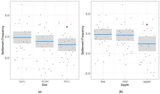 Partial plots of the density model for all significant predictors—Fixed-effect GLM with a Tweedie distribution—explaining the settlement patterns Holothuria arguinensis larvae for the factor Diet (a) and factor Depth (b). The * notation indicates the significant differences with the reference level analysed in this GLM.