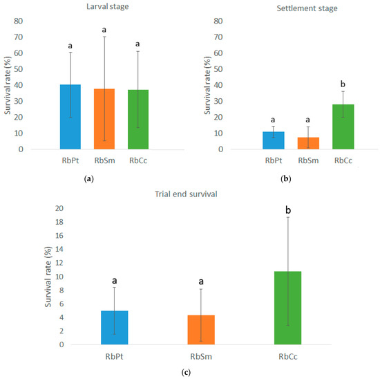 Survival percentage throughout the trial, across all tested surfaces and tank walls, between (a) larval stage (3rd to 16th day of trial); (b) settlement stage (16th to 21st day of trial) and (c) throughout the growth trial (between 3rd and 21st day of trial), for all 3 chosen diets (Diet RbPt = Rhodomonas baltica + Phaeodactylum tricornutum; Diet RbSm = Rhodomonas baltica + Skeletonema marinoi and Diet RbCc = Rhodomonas baltica + Chaetoceros calcitrans). Different letters indicate statistically significant differences of survival (p < 0.05) between diets.