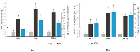 Regarding the growth of surviving individuals, juveniles fed with diet RbSp (Fresh weight = 0.57 ± 0.15 g) and diet RbCcSp (Fresh weight = 0.48 ± 0.05 g) showed a significantly higher weight than individuals fed with diet RbCc (Fresh weight = 0.27 ± 0.08) according to a One-Way ANOVA [F(2, 196) = 3.579; p = 0.0030; Tukey < 0.05]. This weight gain is also reflected in their mean SGR throughout this period, where individuals fed with diets RbSp (SGR = 0.31 ± 0.08 %·day−1) and RbCcSp (SGR = 0.25 ± 0.03 %·day−1) stand out as having a significantly higher growth than individuals fed with diet RbCc (SGR = 0.14 ± 0.04 %·day−1), according to a One-Way ANOVA [F(2, 7) = 6.9610; p = 0.0273; Tukey < 0.05] (Figure 9a).