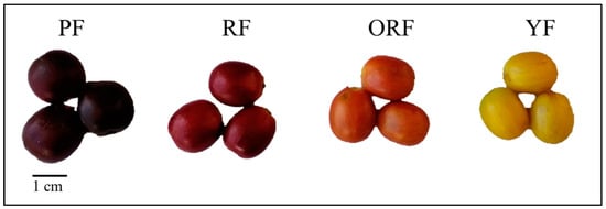 Ripe fruit samples (berries) of the four Bourbon coffee (Coffea arabica) varieties used in this study. Dark purple (PF)-, Red (RF)-, Orange (ORF)-, and Yellow-colored berries (YF).