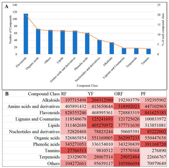 A total of 579 metabolites were detected by UPLC-MS/MS in the berries of the four coffee varieties. These metabolites belong to 11 compound classes (Figure 3). The top five compound classes were flavonoids (19.86%), organic acids (12.44%), others (saccharides and alcohols, vitamins and others, 11.92%), lipids (11.74%), and amino acids and derivatives (11.57%) (Figure 3; Table S1). The remaining classes included phenolic acids (10.54%), nucleotides and derivatives (7.08%), alkaloids (5.87%), lignans and coumarins (3.11%), terpenoids (3.11%), and tannins (2.76%) (Figure 3A). The sum of all compounds within each class differed among the varieties such that RF was rich in tannins, YF in alkaloids, lignans and coumarins, and lipids, ORF in amino acids and derivatives, organic acids, and terpenoids, and PF in flavonoids, nucleotides and derivatives, and phenolic acids (Figure 3B). These observations suggest that each of the studied varieties offers a unique nutritional value based on the presence of compounds. These results are important from the point of view of health benefits and consumer preference (Figure 3B).