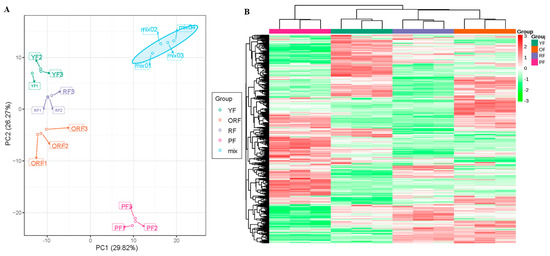 Pearson correlation analysis based on the ion intensities of the 579 metabolites displayed high reproducibility between biological replicates (correlation coefficients ≥ 0.79) (Figure S1). In addition, PCA explained that there was 56.09% variability among the four varieties (Figure 4A). The HCH based on the ion intensities of the 597 metabolites showed that the biological replicates grouped as two clusters. Cluster 1 consisted of only PF, while Cluster II included YF, RF, and ORF (Figure 4B). These results suggest that coffee fruit peels differ in their metabolite composition such that YF, RF, and ORF may contain a greater number of common metabolites, whereas the composition of PF might be different from the other three varieties. Overall, the Pearson’s correlation, PCA, and HCH analyses indicate the presence of metabolome variability which could account for the difference in the nutritive value of the four varieties.