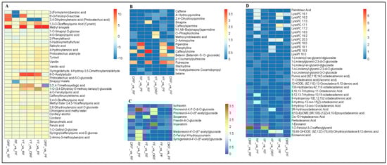 Twelve samples (4 coffee varieties × 3 biological replicates), each weighing about 3 g, were crushed into powder following vacuum freeze-drying with a mixer mill MM400 and zirconia beads (15 mm) for 1.5 min at 30 Hz. Thereafter, sample powder of 100 mg was extracted overnight at 4 °C in 1.0 mL 70% aqueous methanol and centrifuged for 10 min at 10,000× g. The extracts were filtered and transferred to a new tube for ultra-high-performance liquid chromatography-tandem mass spectrometry (ULPLC-MS/MS) analysis as reported earlier [27]. Briefly, widely untargeted metabolite profiling was performed with a self-built database by MetWare Biotechnology Co., Ltd. (Wuhan, China). A control analysis was conducted by mixing sample extracts from four samples to check in the repeated analyses. The metabolites were assessed by secondary spectrum information by qualitative means. The metabolites were quantified by a multi-reaction monitoring mode analysis via triple quadruple-bar mass spectrometry, AB4500 Q TRAP UPLC/MS/MS System, equipped with an ESI Turbo Ion-Spray interface. The system worked in both positive and negative ion modes and was controlled by Analyst 1.6.3 software (AB Sciex). The ESI source operation parameters were set as follows: ion source, turbo spray; source temperature 550 °C; ion spray voltage (IS) 5500 V (positive ion mode)/−4500 V (negative ion mode); ion source gas I (GSI), gas II(GSII), curtain gas (CUR) was set at 50, 60, and 25.0 psi, respectively; the collision-activated dissociation (CAD) was high. Instrument tuning and mass calibration were undertaken in 10 and 100 μmol/L polypropylene glycol solutions in QQQ and LIT modes, respectively. QQQ scans were obtained as MRM experiments with collision gas (nitrogen) set to medium. DP and CE for individual MRM transitions were done with further DP and CE optimization. A specific set of MRM transitions was checked for each period according to the metabolites eluted within this period.