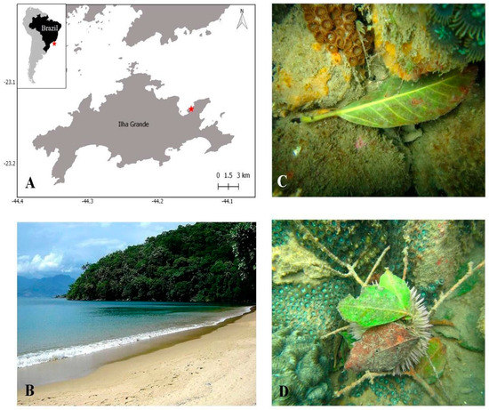 The study site at Abraãozinho, Ilha Grande Bay (IGB), Brazil: (A) the location of the study region and site (red star); (B) photograph illustrating the marine riparian vegetation formed by Atlantic rainforest adjacent to the rocky shore; (C) a leaf on the reef derived from marine riparian vegetation; (D) the sea urchin (Lythechinus variegatus) exhibiting covering behavior using leaves derived from an adjacent marine riparian area composed of Atlantic rainforest.