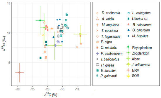 We identified seven major food resources, among them the MRV, marine sedimentary organic matter, phytoplankton, macroalgae and zooplankton. We also identified seventeen major consumers in the food web, among seven suspension feeders, one mixotroph, two deposit feeders, four herbivores and three omnivores (Table 1 and Table S1). MRV, which represents the allochthonous basal food resource, had the lowest isotopic value of δ13C (mean = −30.0; SD = ± 0.6; n = 3) and had a different signature than autochthonous marine resources, which allowed us to differentiate sources in the consumers. The calcareous algae J. adhaerens presented carbon isotopic values (−8.0; ±0.4; n = 3) that were different from other algae, so it separated from the main algae group (t-test for J. adhaerens and P. gymnospora: t = −18.009, df = 1.601, p = 0.008; J. adhaerens and Cladophora sp.: t = −37.391, df = 3.936, p < 0.0001; J. adhaerens and H. musciformis: = −27.674, df = 3.981, p < 0.0001). Overall, other marine resources showed similar δ13C values, including marine sedimentary organic matter (Figure 2 and Table S1). Food resources had the lowest average δ15N values (p. gymnospora: 4.5, ± 1.9, n = 3; Cladophora sp.: 6.7, ± 0.6, n = 3; H. musciformis: 6.4, ± 0.3, n = 3; J. adhaerens: 7.4, ± 0.3, n = 3), with the exception of phytoplankton and zooplankton (phytoplankton: 9.8 ± 1.9, n = 2; zooplankton: 8.5 ± 2.0, n = 2), and the lowest values were of MRV (terrestrial vegetation: 1.0 ± 0.5, n = 3). The herbivorous gastropod Littorina sp. and the omnivorous crustacean M. hispidus showed heterogeneous isotopic values, especially for the δ15N, consistent with the higher trophic level occupied by this crustacean in relation to the gastropod (Figure 2 and Table S1).