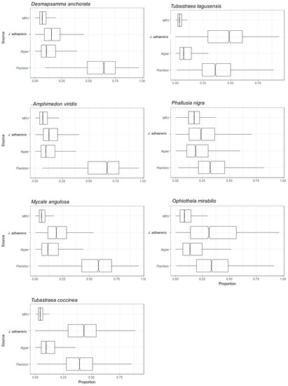 Suspension feeders have morphological structures capable of capturing suspended particles as a potential source of food, either items large enough to be seized individually or smaller particles obtained in sufficient quantity through filter feeding [69,75]. Four of the seven suspension feeders, the ascidian and all the sponges had plankton as their main assimilated resource. Plankton was also the main resource for the anemone B. caissarum. The second resource most assimilated by the suspension feeders was the articulated calcareous algae J. adhaerens.
