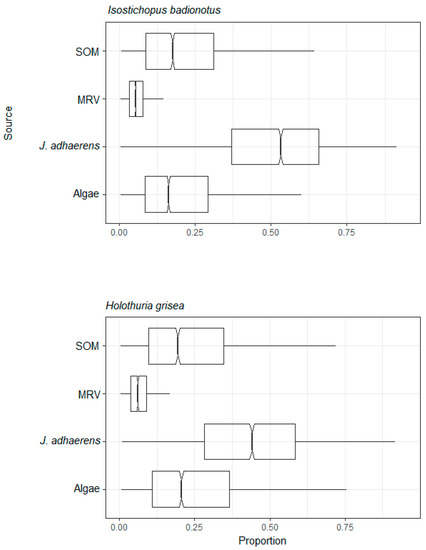 In isotopic space, as shown in Figure 2, the δ13C values of the sedimentary organic matter were central when compared to the range which the other resources presented (from Jania adhaerens to MRV), which may suggest a contribution from multiple sources for the organic matter in the sediment. Marine sediment is usually partially composed of marine derived organic matter but may include terrestrially derived organic matter as well. Terrestrially derived organic matter is higher in marine sediments near the coast, and even seabed sediments deposited in areas remote of the continents may also contain a mixture of organic matter derived from marine and terrestrial processes [86]. It is interesting to note that despite this the deposit feeding sea cucumbers, which inhabit the base of the reef at the sand–rock interface and consume large amounts of sedimentary organic matter, predominantly derived their resources from Jania adhaerens, which is a highly abundant part of the turf community [22].