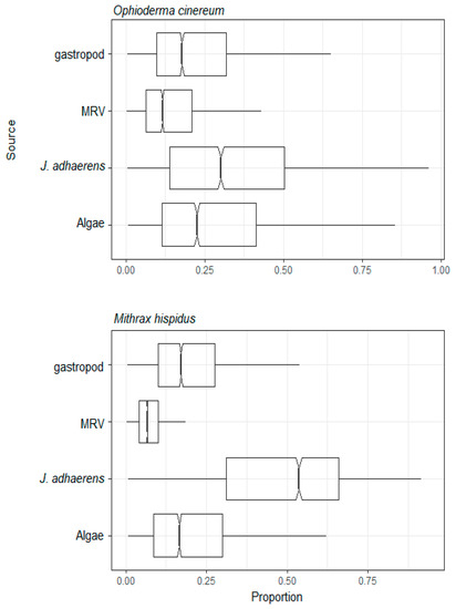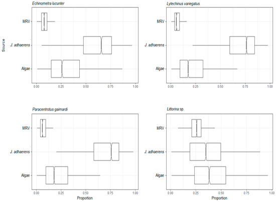 The assimilation of different resources was similar for consumers of the deposit feeding group, where the most assimilated resource was calcareous algae J. adhaerens, followed by sedimentary organic matter. MRV was the least assimilated resource (Figure 5 and Table S2). In the herbivore group, the least assimilated resource for sea urchins was MRV. They had the highest assimilation of the calcareous algae J. adhaerens, followed by algae, while for the gastropod Littorina sp., the most assimilated resource was algae (Figure 6 and Table S2). The average δ15N value of B. caissarum (omnivore group I) was greater than all potential resources, except for the crustacean M. hispidus (Figure 7 and Table S2). Even when combining the potential resources of gastropod Littorina sp. and crustacean M. hispidus to the mixing model of the B. caissarum, the percentages of assimilation remained similar to the mixing model with these two potential resources separated. Plankton was the resource most assimilated by the omnivore group I. The average assimilation of MRV and algae were higher than that of J. adhaerens, which were the least assimilated resources (Figure 7 and Table S2). Consumers in omnivore group II had a very similar proportional resource assimilation. The most assimilated resource in this group was the calcareous algae J. adhaerens. MRV was the least assimilated resource. For the crab, the gastropod Littorina sp. was the second most assimilated resource, and for the brittle star, algae was second most consumed resource, followed by the gastropod (Figure 8 and Table S2). The results of the mixing model by trophic groups (Table S3) showed that the average MRV assimilation varied from 4–8% for suspension feeders, deposit feeders, mixotrophs, omnivores II and herbivores to 11% for herbivores and for omnivores I. The mean MRV assimilation by trophic groups obtained from the mixing models by species varied from 7–10% for suspension feeders, mixotrophs and deposit feeders to 11–12% for herbivores and omnivores (Table S2).
